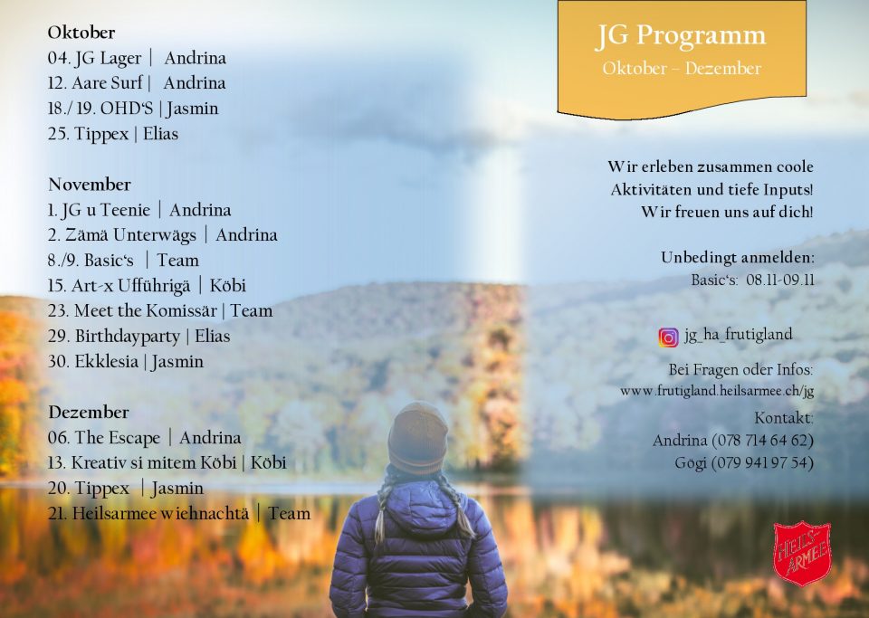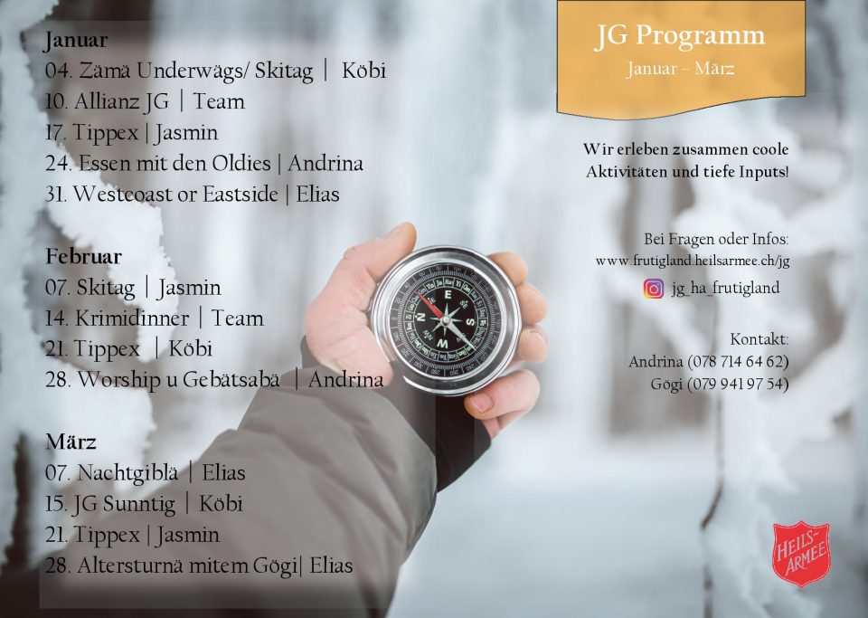Jasmin, Leiterin. Isch ä richtegi Powerfrou, wome gärn unterschetzt. Si packt gärn fescht zue sigs im Bruef mit dä Outos oder ir Friizyt am Fels. Ihres Härz schlaht o ir JG derfür, dassmer im Gloube vorwärts chömme.